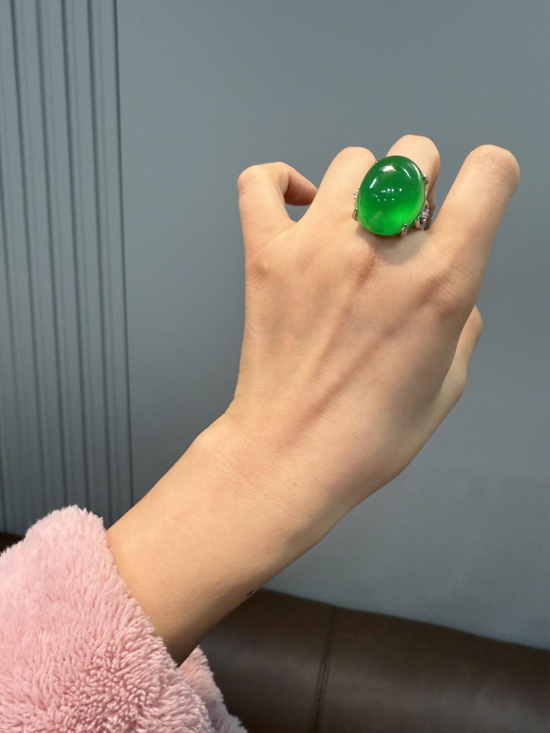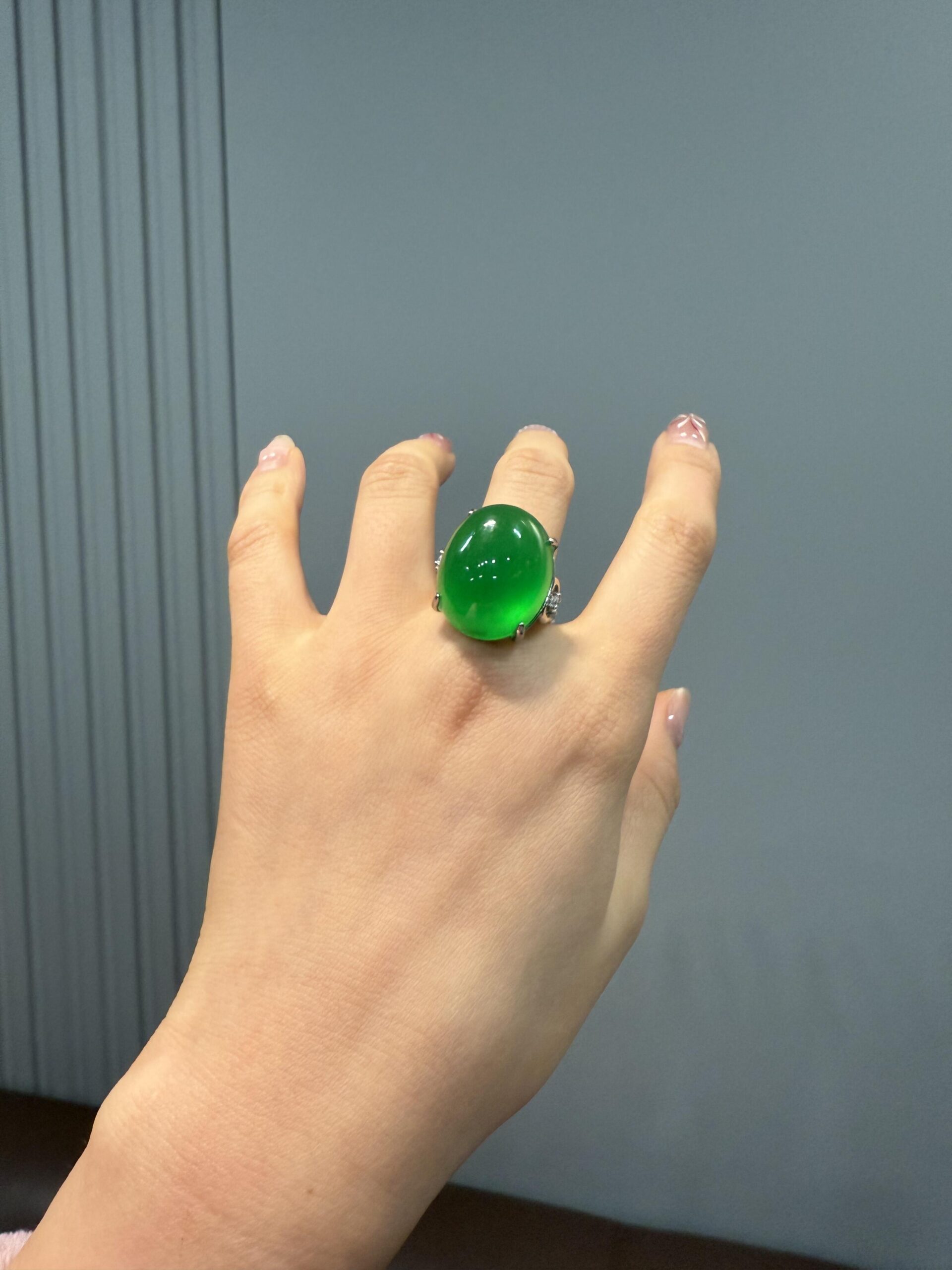 d with green main stones (with a diameter of ≥ 16mm). Under strong light, it exhibits the “dragon stone type” fluorescence (with a pale cool blue-green tone)