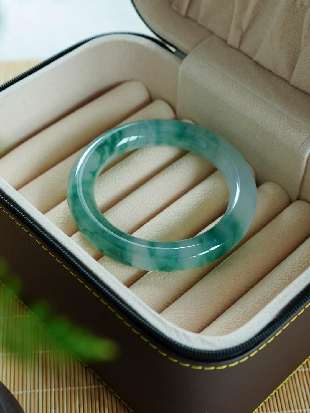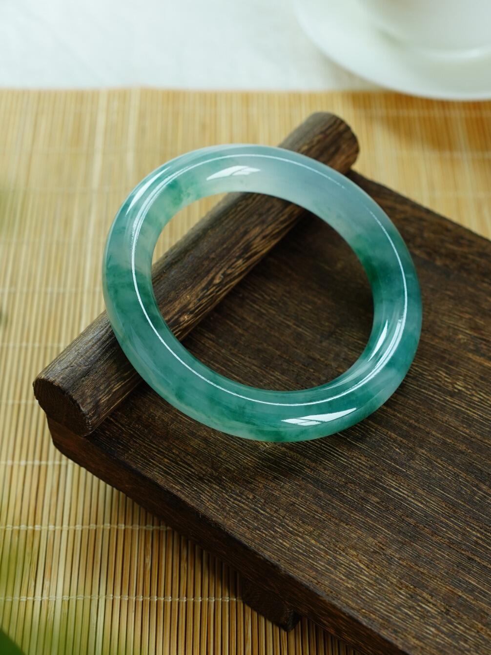Crafted from natural jadeite (Type A), this bracelet boasts a fine texture and lustrous sheen, available in vibrant green, lavender, and icy white hues. Designed in classic round or flat profiles, its smooth, polished finish symbolizes peace and auspiciousness. With translucent clarity and elegant floating floral patterns, it combines collectible value with timeless elegance, perfect for enhancing the grace of oriental beauty.